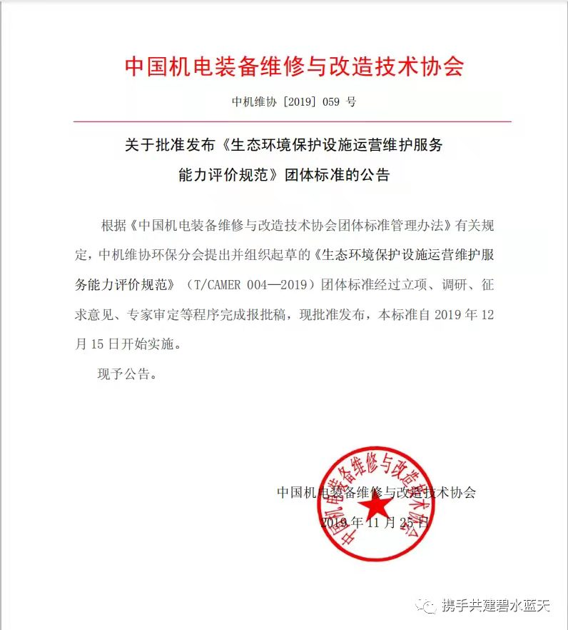 由中國機電裝備維修改造技術協會發起,聯合河北省環保治理運營行業協會、佛山市中環環保技術研究中心、中機國際工程設計研究院有限責任有限公司華東分院、廣東敏義環境科技有限公司、深圳市環境治理光電產業有限公司、佛山攸威光電科技有限公司、山東領先機械制造有限公司、山東濟寧精誠科技有限公司、山東棗莊遠程環保科技有限公司、石家莊科林威爾環保科技有限公司以及石家莊曼特水處理有限公司共同起草的《生態環境保護設施運營維護服務能力評價規范》團體標準,于2019年11月25日獲批發布,并于2019年12月15日正式實施。