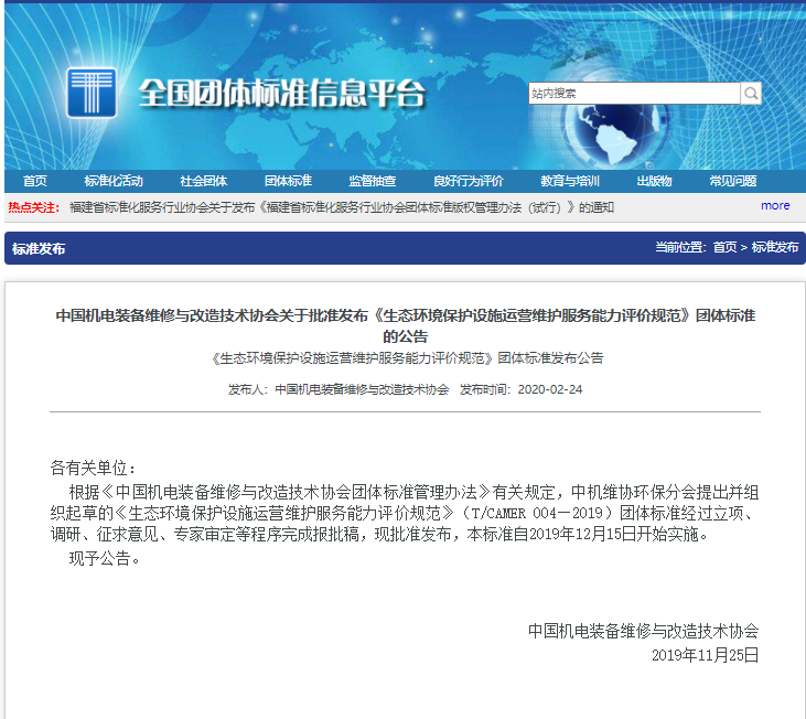由鳳凰網報道,由中國機電裝備維修改造技術協會發起,聯合河北省環保治理運營行業協會、佛山市中環環保技術研究中心、中機國際工程設計研究院有限責任有限公司華東分院、廣東敏義環境科技有限公司、深圳市環境治理光電產業有限公司、佛山攸威光電科技有限公司、山東領先機械制造有限公司、山東濟寧精誠科技有限公司、山東棗莊遠程環保科技有限公司、石家莊科林威爾環保科技有限公司以及石家莊曼特水處理有限公司共同起草的《生態環境保護設施運營維護服務能力評價規范》團體標準,于2019年11月25日獲批發布,并于2019年12月15日正式實施。這是由協會牽頭制定的又一項關于生態環境行業方面的團體標準,不僅為提高生態環境保護設施運營維護企業的運營服務質量控制奠定良好的基礎,更為第三方治理行業的良性健康發展保駕護航。